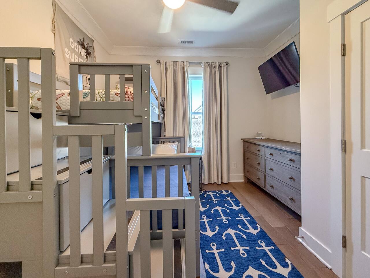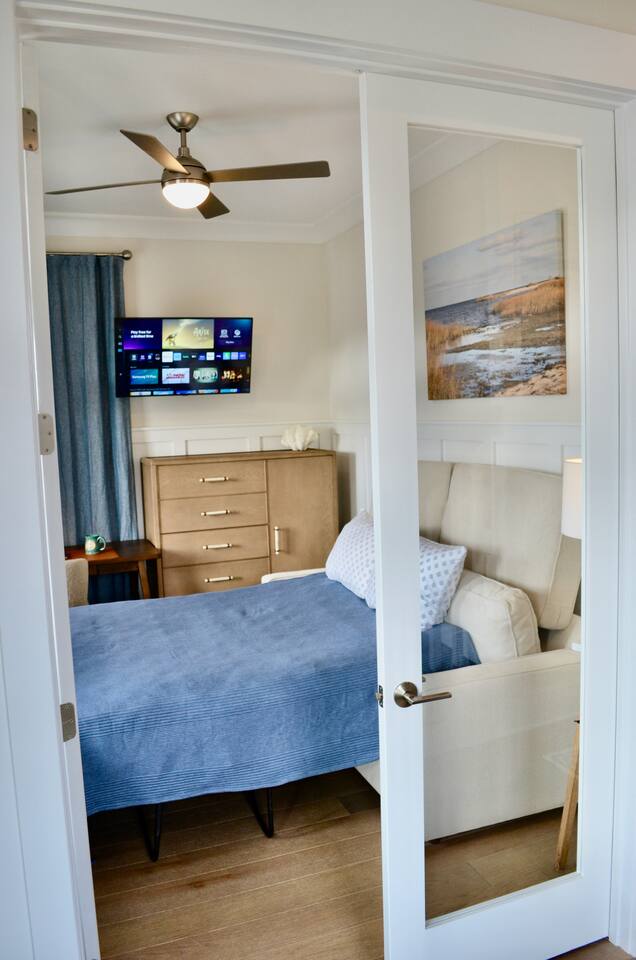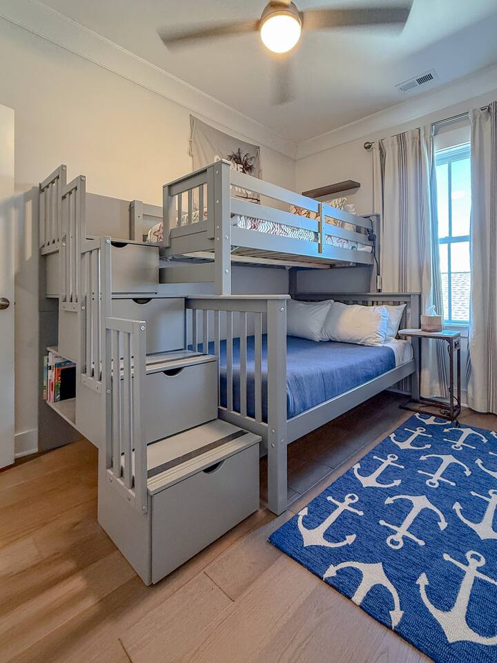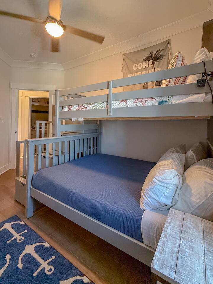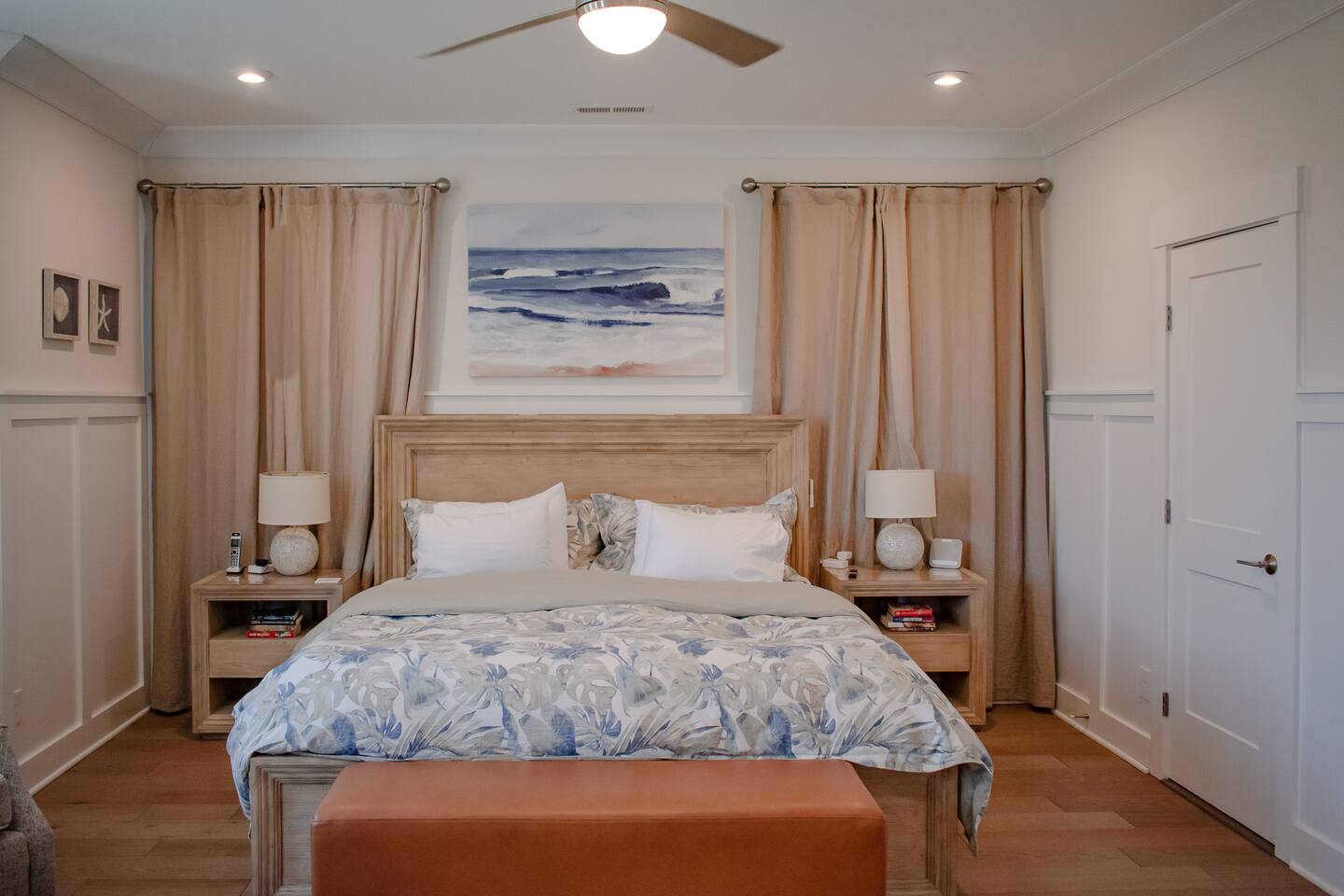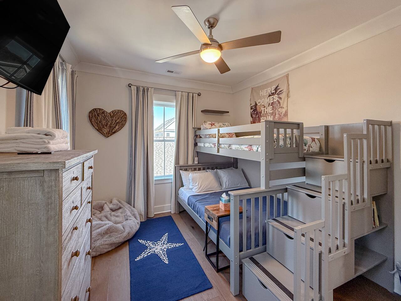 Wave Haven is a newly built single-family home that sleeps 10 guests and contains all hardwood floors. The main level contains a front room with a workstation and a comfortable pull-out (Queen) couch. The half bath can also serve guests staying on the main level. The living area has a breakfast nook that seats two, a dining table that seats six, and a counter that seats three. The living room contains a TV, gas fireplace, couch, swivel chair, and leather recliner, perfect for a nap or glass of wine. The area also contains a bar cart with wheels, which can double as a serving area. The kitchen serves as your home-away-from-home, with modern appliances and all of the amenities of your kitchen. The double-stack cabinets and pantry provide ample space for your food and beverages of choice! The upper level contains three bedrooms and two bathrooms. The master bedroom contains a king-size bed, a private bathroom, a workstation ideal for remote workers, a walk-in closet, a TV, and a reading nook. The two additional bedrooms each contain a TV and a bunk bed, which sleeps three—two twins and one full. The bunk beds also contain drawers in the stairs, so storage won’t be an issue. These two bedrooms share a full bathroom with a tub. The second level also contains a full Samsung front-load washer and dryer, an iron, and an ironing board. The property also has a screened porch and fan for outdoor eating and comfort. You can also slide into Adirondack chairs on the paver patio. You can enjoy a game of cornhole, outdoor checkers, and additional games. Wave Haven has a detached garage with two bays and two additional parking spots in front of the property. While the property doesn’t offer a golf cart (you can rent one in town), it has an outlet for charging. Additionally, Wave Haven has an outdoor shower to wash off from your amazing time at the beach. We offer a family-friendly environment, and we are mindful of those with allergies. As such, there is no smoking, and pets are not allowed. For those visiting with children, we provide a pack-and-play, Bumbo seater, high chair, corner protectors for the living room furniture, outlet protectors, and life vests. We provide family-friendly board games like Jenga and Monopoly. The property also has five smart TVs—so no fighting over what to watch! Finally, for remote workers, the house has two separate workstations and Ethernet connections for increased speed and reliability.